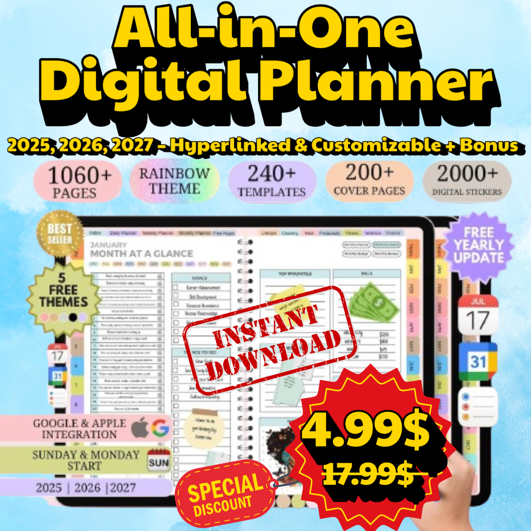 All-in-One Digital Planner 2025, 2026, 2027 – Goodnotes Planner, Apple Google Calendar + Bonus 50+ Templants planners